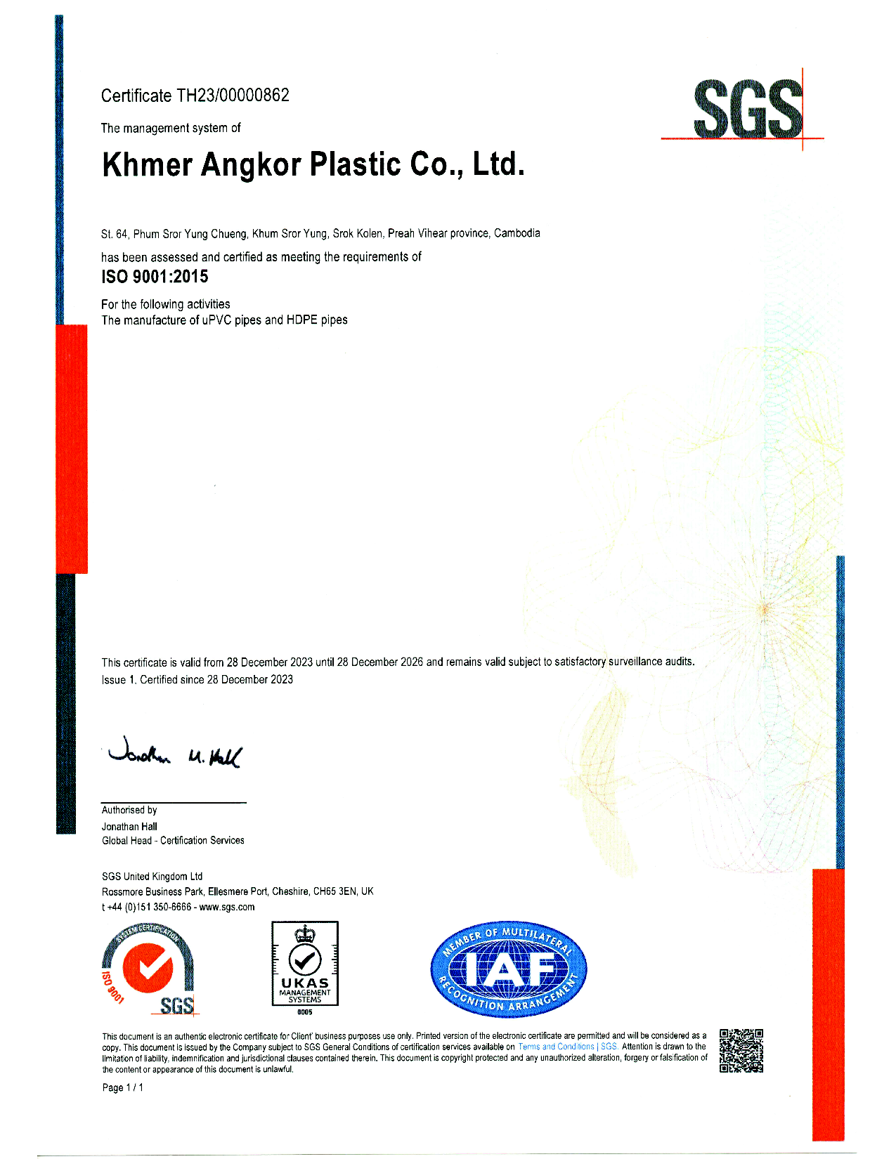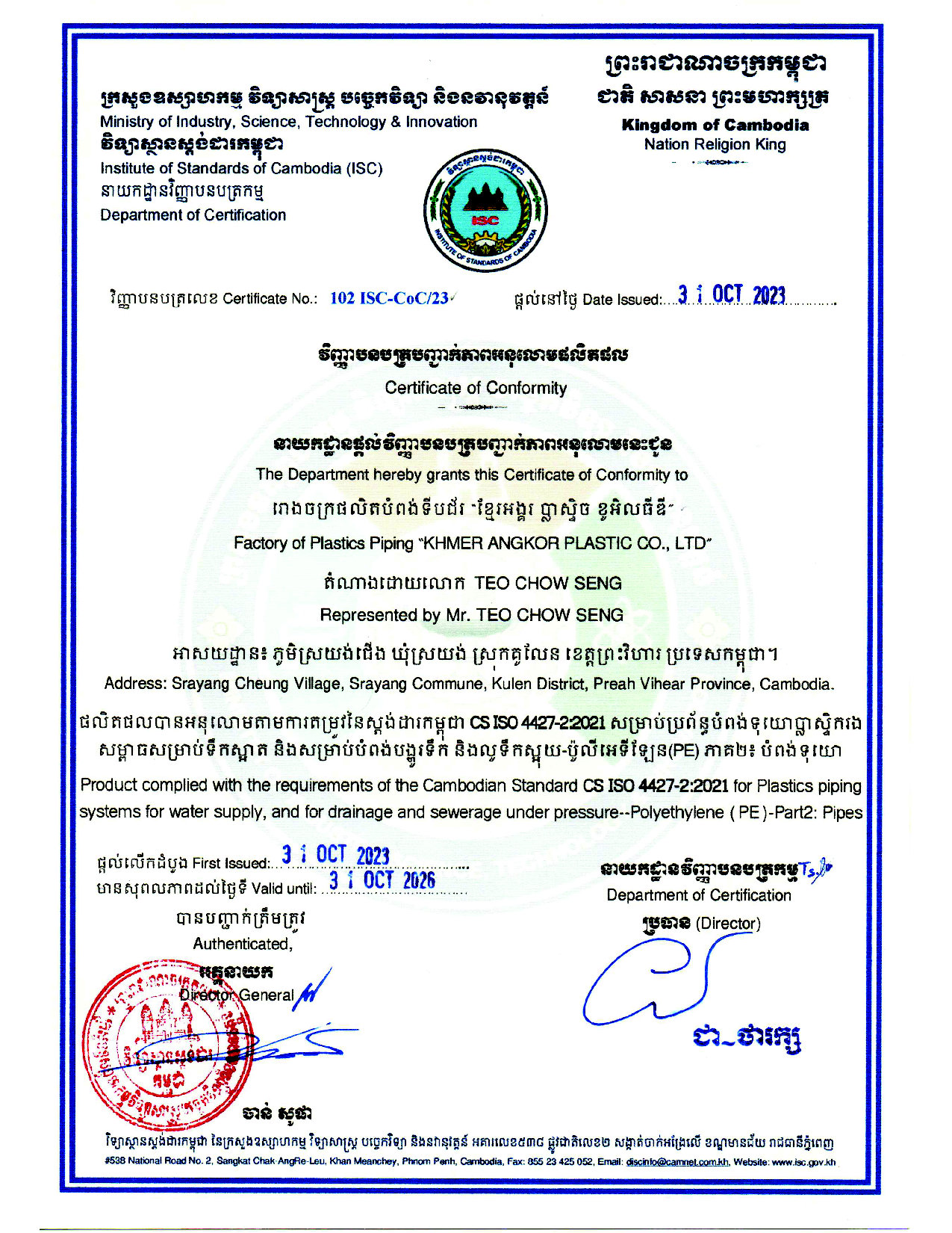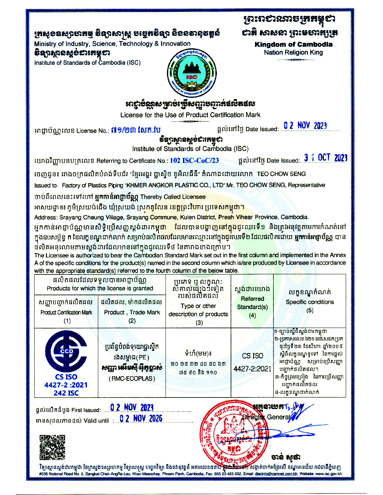RMC-ECOPLAS is a trademark own by Khmer Angkor Plastic Co., Ltd. Which produce High Density Polyethylene (HDPE) and Low Density Polyethene (LDPE) pipe with advanced technology facilities, and know-how from French and China. Our manufacturing process is assured by the quality control by our professional engineers and compliances base to ISO 9001: 2015 which is certified by SGS and accredited by Institute of Standards of Cambodia for our ISO 4427-2:2021.